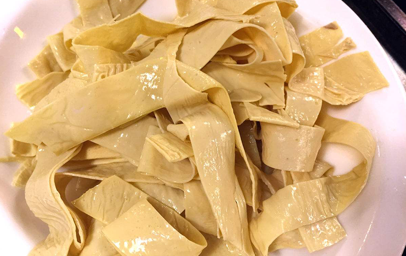 豆皮又称千张(thin sheets of bean curd),由于在特质工具内层层压制,出品时候看起来有千百张叠加在一起而在安徽等地称为千张,北方某些地方称为豆腐皮。它是一种特殊的豆制食品,是一种薄的豆腐干片,可以理解成一片特别大特别薄有一定韧性的豆腐干,色米黄,可凉拌,可清炒,可煮食。湖北有名菜“千张肉丝”,即以千张为原料。